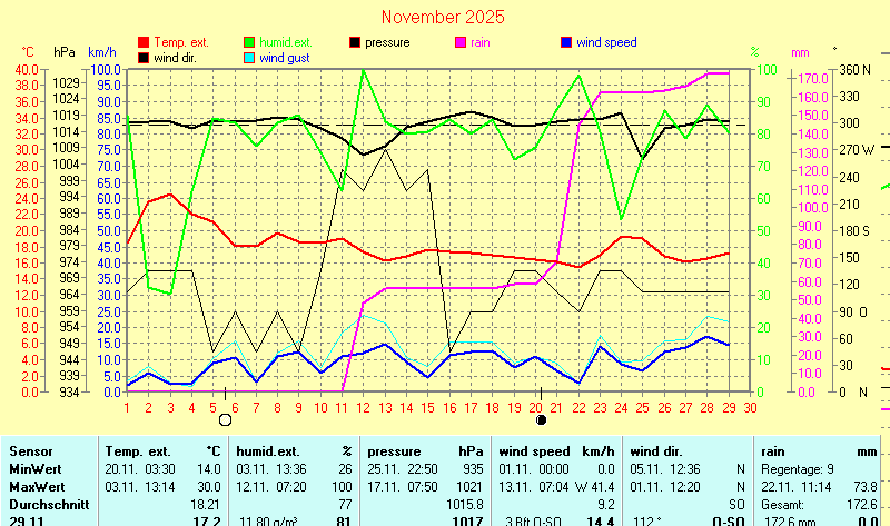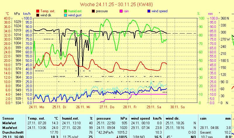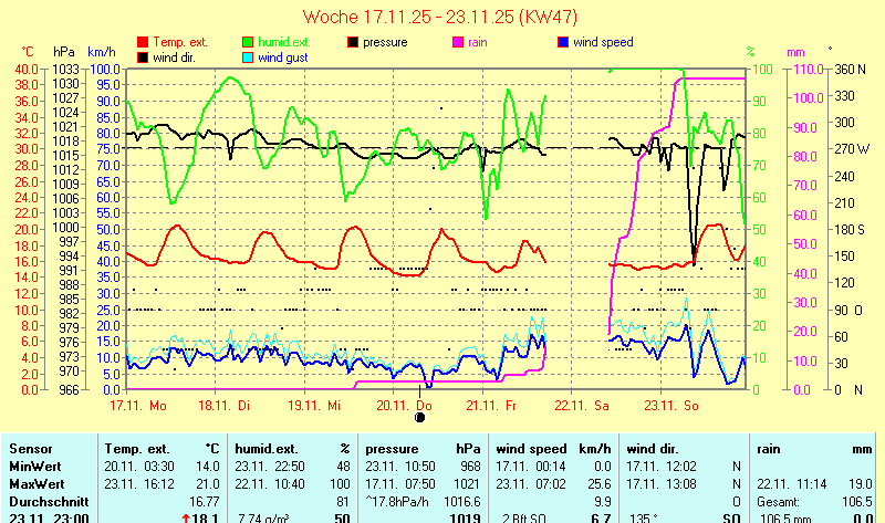 | Die dargestellten Werte repräsentieren die Daten der letzten 24 Stunden! Barometer is corrected to sealevel! | |||||||||||||||||||||||||||||||||