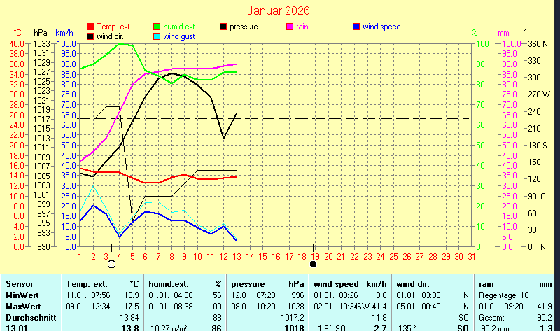 | Die dargestellten Werte repräsentieren die Daten des aktuellen Tages! Barometer is corrected to sealevel! | |||||||||||||||||||||||||||||||||